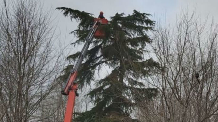 Trabajadores de la Concejalía de Servicios Generales, tras recibir el permiso de la Consejería de Medio Ambiente de la Comunidad de Madrid, han retirado un nido de cigüeñas que se encontraba en la copa de un cedro de la piscina municipal y otro de cotorras argentinas que había en el mismo ejemplar, por el peligro para la salud y seguridad de las personas que estos suponían.