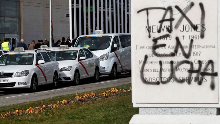 Continúan llegando imágenes de la que está siendo la cuarta jornada de la huelga indefinida que se está llevando a cabo por parte de los taxistas madrileños. "Taxi en lucha" es un pintada que se repite por todo el recinto de Ifema.