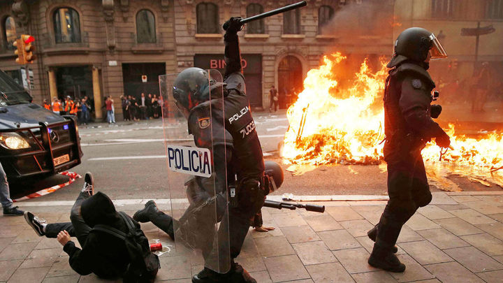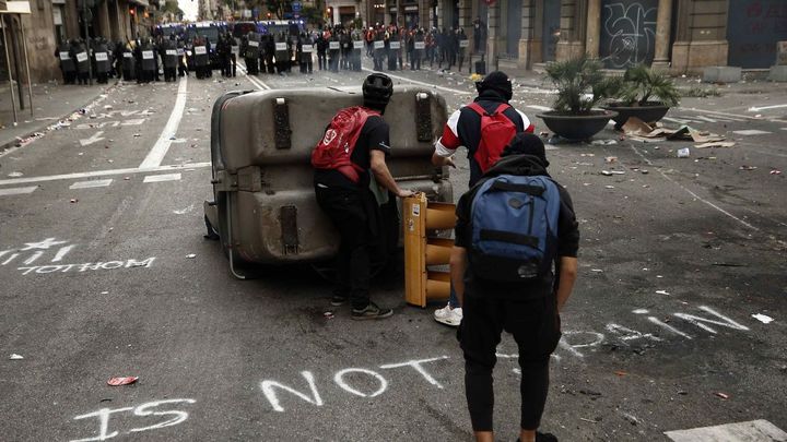 La violencia en Barcelona ha comenzado este viernes antes que en días anteriores. Una vez desconvocada la gran manifestación, sobre las 18.20 horas, han empezado a actuar los radicales en acciones coordinadas en varios puntos de la ciudad.
