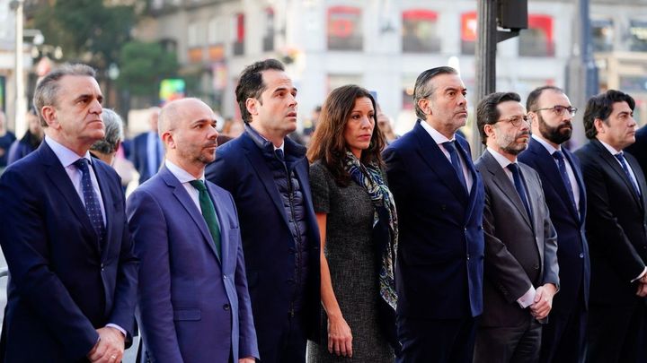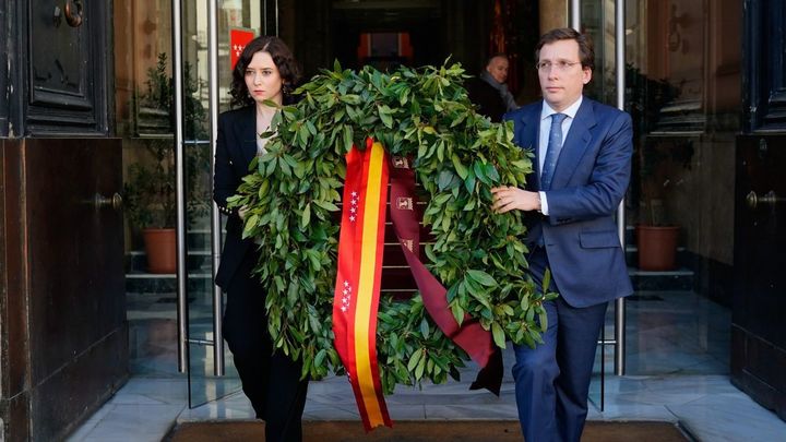 Después del repique de las campanas del reloj de la Real Casa de Correos, Díaz Ayuso y Almeida han subido a un escenario instalado junto a la placa para colocar una corona de laurel con las banderas de España, la Comunidad de Madrid y el Ayuntamiento de la capital, en memoria de las víctimas.