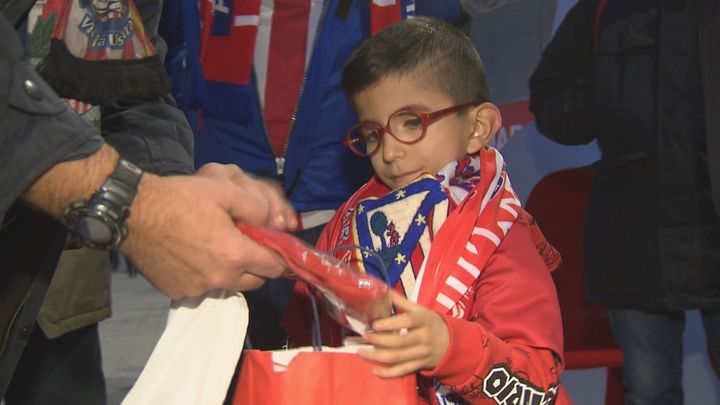 La Unión Internacional de Peñas del Atlético de Madrid se ha movilizado y ha colmado de regalos a Hugo antes del partido de la Liga de Campeones entre el Atleti y el Mónaco.