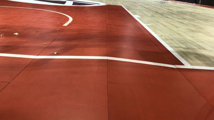 El parqué del Pabellón Fernando Martín había sido puesto nuevo este verano y para retirarlo y sustituir las tablas afectadas es necesario desmontar la grada supletoria del fondo situado tras esa canasta, lo cual hacía imposible una reparación en el momento, según explicaron fuentes del club fuenlabreño.