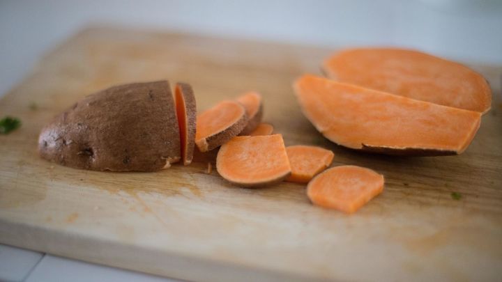 De primero, un dulcísimo boniato asado. La ración de hidratos de carbono para cuatro personas, la tienen cocinando: un boniato mediano con una cucharada sopera de aceite de oliva. A este denle más sabor con ajo en polvo y perejil al gusto.