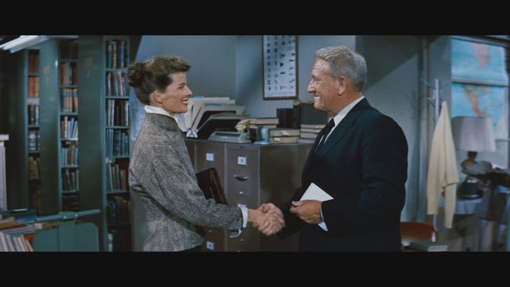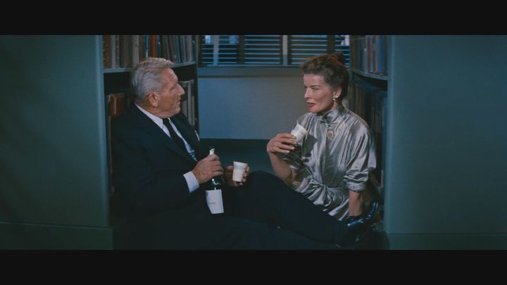 Su otra esposa – luego descubriremos a qué se refiere el título – es una suave y deliciosa comedia romántica de esas que a la pareja formada por Hepburn y Tracy se les daba de maravilla interpretar como si de un partido de tenis se tratara. Esta fue la primera vez que les vimos juntos en color y la penúltima que actuaron juntos. Entre una y otra transcurrieron diez tristes años para los dos. Basada en la vida de la bibliotecaria que organizó el fondo documental de la emisora de televisión CBS, la señora Agnes Law, su insólita historia dio pie primero a una divertida obra de teatro y posteriormente a una no menos agradable película a la que Walter Lang, hombre de musicales con auténtico buen rollo y mucho encanto y de comedias familiares con Clifton Web o Danny Kaye como protagonistas, le dio esa pátina de simpático entretenimiento con tu toque de profundidad. La película de esta noche tiene sesenta años de vida pero habla de asuntos tan importantes y tan a la orden del día como el acoso y derribo que sufren las personas de edad y experiencia en determinados ámbitos laborales, la resistencia al cambio que tan a menudo nos amarga la vida o como la tecnología se impone en nuestro día a día a menudo sin pedir permiso. Lang, como todos los que con ellos trabajaron les permitieron a los Hepburn/Tracy desplegar su ingenio hasta el punto de que algunas escenas, como ésa en la que Katharine Hepburn acabó cayéndose prácticamente de la silla de risa, fueron improvisadas y nos dan una idea del excelente ambiente de trabajo que reinaba en aquel plató.