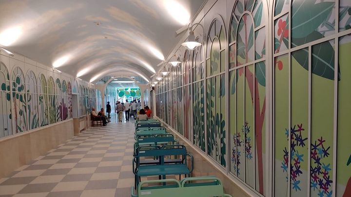 Como si de un calco se tratara. Los pasillos de la primera planta del Hospital Niño Jesús ofrecen espacios sorprendentes: desde el Palacio de cristal hasta la Rosaleda.
