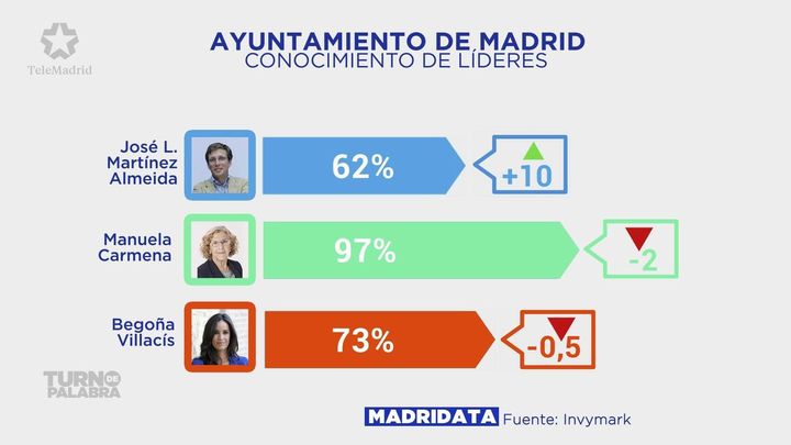 A la espera de confirmar quién será el candidato socialista a la Alcaldía de Madrid, la encuesta presentada por Turno de Palabra desvela de nuevo la nota que reciben Manuela Carmena, José Luis Martínez Almeida y Begoña Villacís por parte de los madrileños.