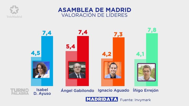 El socialista Ángel Gabilondo sigue siendo el líder regional mejor valorado, con una nota de 5,38 y siendo conocido por el 91,1% de los madrileños. Los votantes socialistas le suben la nota al 7,36. Mientras, Isabel Díaz Ayuso tiene una calificación media del 4,46, siendo conocida por el 60,9% de los madrileños. Los votantes 'populares' aprueban su candidatura con una nota de 7,37.