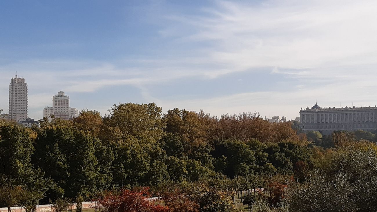 Pero si levantamos la cabeza tendremos una magnífica vista de buena parte de la cornisa de la capital. Con el Palacio Real, la Catedral de la Almudena y más a nuestra izquierda la Plaza de España con la Torre de Madrid y el Edificio España.