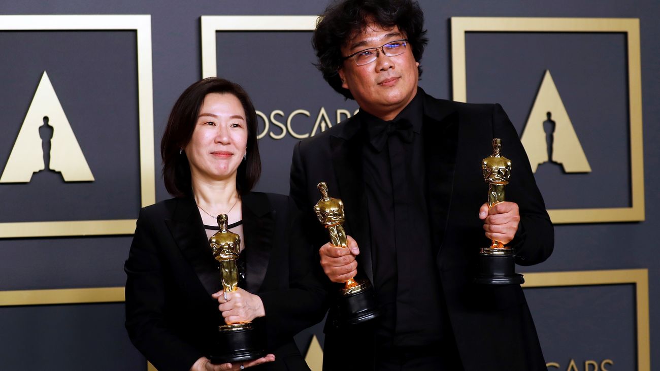 Kwak Sin Ae y Bong Joon Ho con el Oscar a Mejor Película, Mejor Perlícula Internacional y Mejor Dirección