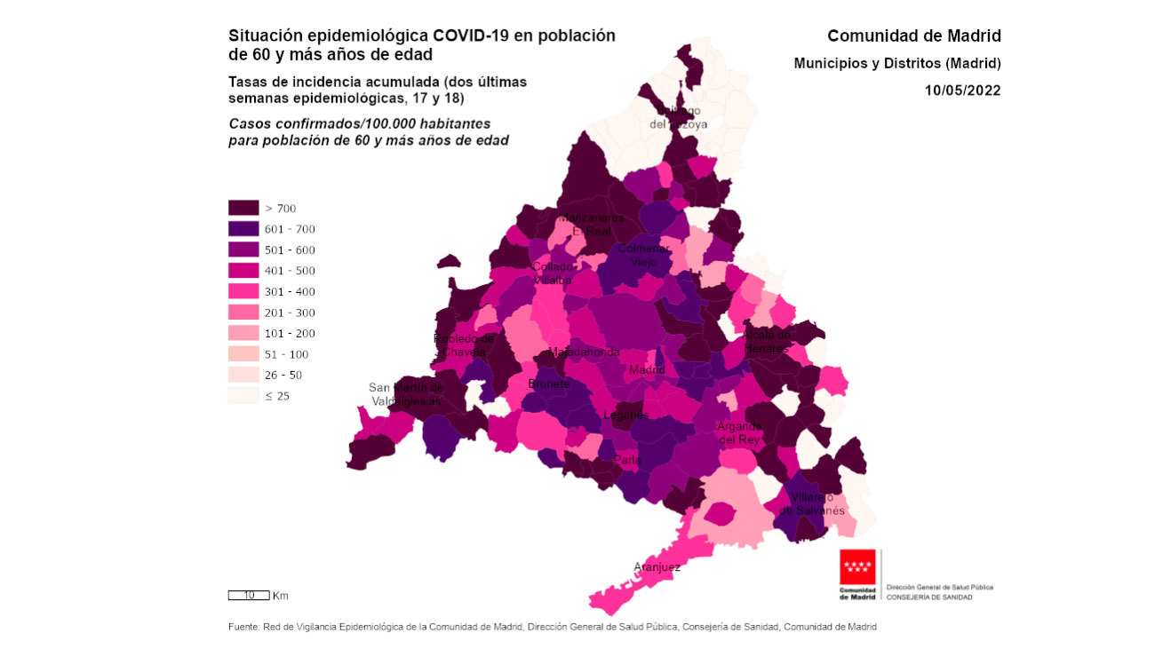 La incidencia acumulada por coronavirus en las últimas dos semanas vuelve a subir en la Comunidad de Madrid y pasa de 480 a 585,1, y de 307,8 casos por 100.000 habitantes en el caso de la incidencia acumulada en los últimos siete días. Los datos se centran en personas de más de 60 años. En el grupo de riesgo de 90 o más años, la incidencias es de 939,3 en las últimas dos semanas.
