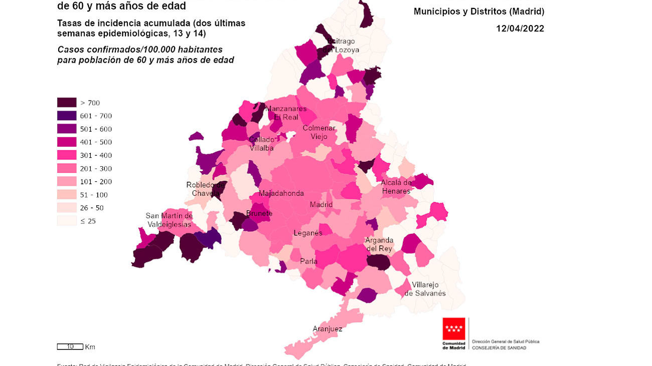 En cuanto a la distribución geográfica de los casos, la mayor incidencia acumulada a 14 días se registra en Pinto, con 360,2 casos por cada 100.000 habitantes, seguido de San Sebastián de los Reyes, con 359,7 casos; los dos únicos municipios que superan la barrera de los 300 casos en este indicador. Tras ellos, les siguen Colmenar Viejo (298,9) y Majadahonda (294,5).
