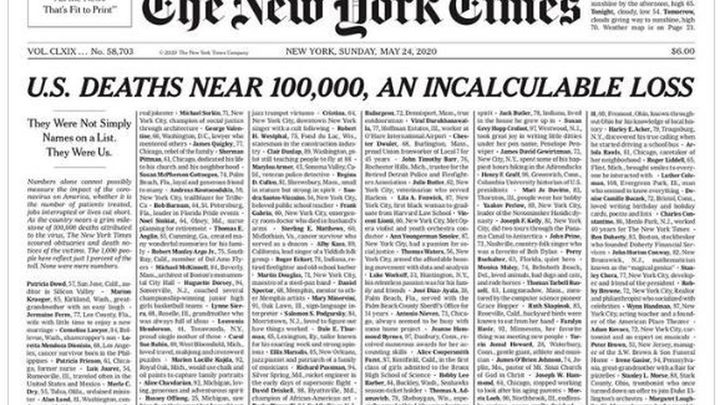 La pandemia de coronavirus deja ya 5,3 millones de contagios y 342.000 muertos en todo el mundo. Estados Unidos, en cabeza de la lista, con cerca de las 100.000 víctimas mortales, se despierta con los nombres de los fallecidos en la portada del 'New York Times'.