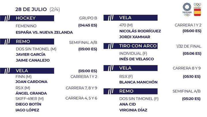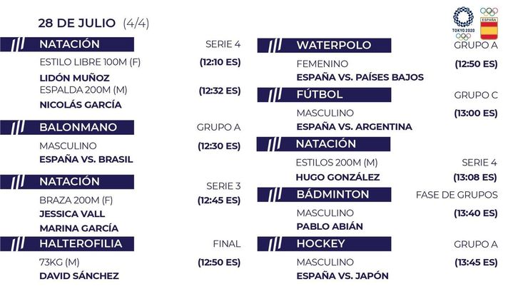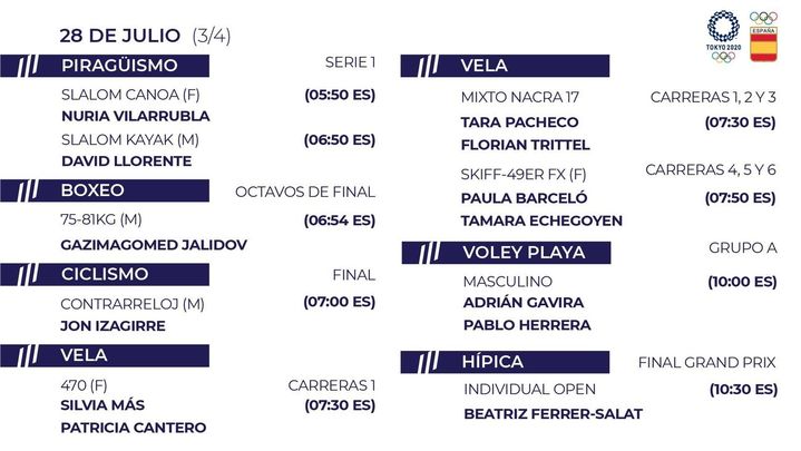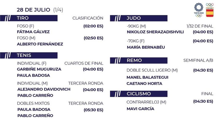 Un miércoles 28 de julio muy intenso con españoles en judo, tiro olímpico, hípica, ciclismo en ruta, hockey hierba, piragüismo slalom, tiro con arco, boxeo, waterpolo, fútbol, vóley playa, natación, bádminton y halterofilia.
