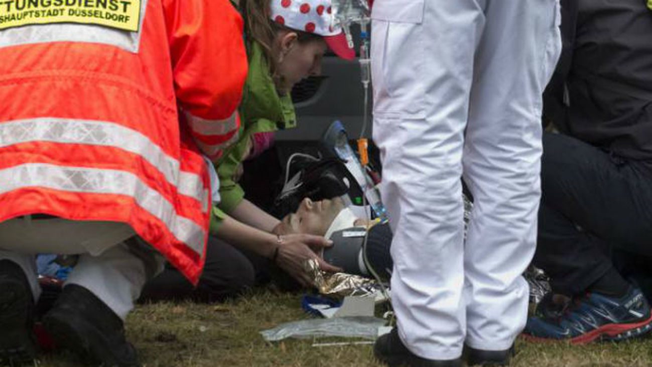 El ciclista murciano, de 37 años, cayó al trazar una curva a izquierdas, cuando se le fue la rueda delantera siendo proyectado contra una valla. Auxiliado por su director, Eusebio Unzue, Valverde se retiró de la carrera. La lluvia está dificultando la prueba inaugural y las caídas se han multiplicado. En la misma curva cayó minutos antes el francés Tony Gallopin. Valverde se encuentra en un centro hospitalario de Düsseldorf.
