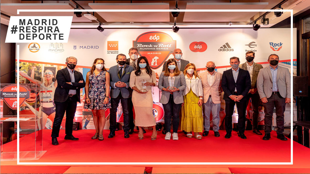 Guillermo Jiménez, presidente de MAPOMA, y Pedro Rumbao, CEO de EDP Rock 'n'roll Running Series Madrid, hicieron entrega de dos distinciones, una al área delegada de deporte del Ayuntamiento de Madrid por su programa Chicas, el deporte nos hace poderosas y la otra el título de Maratoniana de honor a la vicealcaldesa de Madrid, Begoña Villacís.