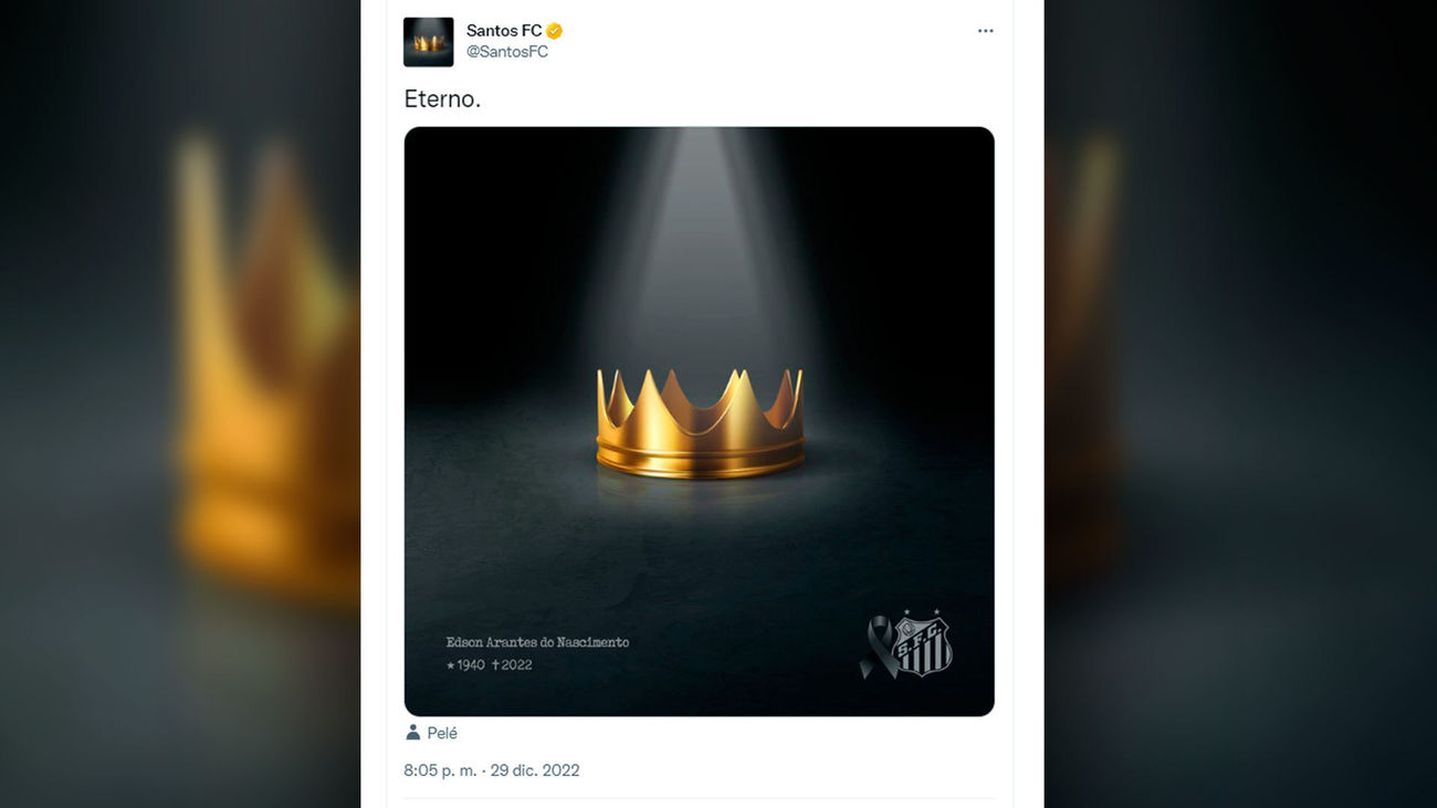 El mundo entero llora la muerte de Pelé, un ídolo del fútbol que trasciende el propio deporte. Poco después de confirmarse el fallecimiento del astro brasileño, el Santos, club que le vio nacer para el fútbol y en el que jugó durante casi toda su carrera, lamentaba la muerte de su "rey", y le dedicaba solamente una palabra: "Eterno".