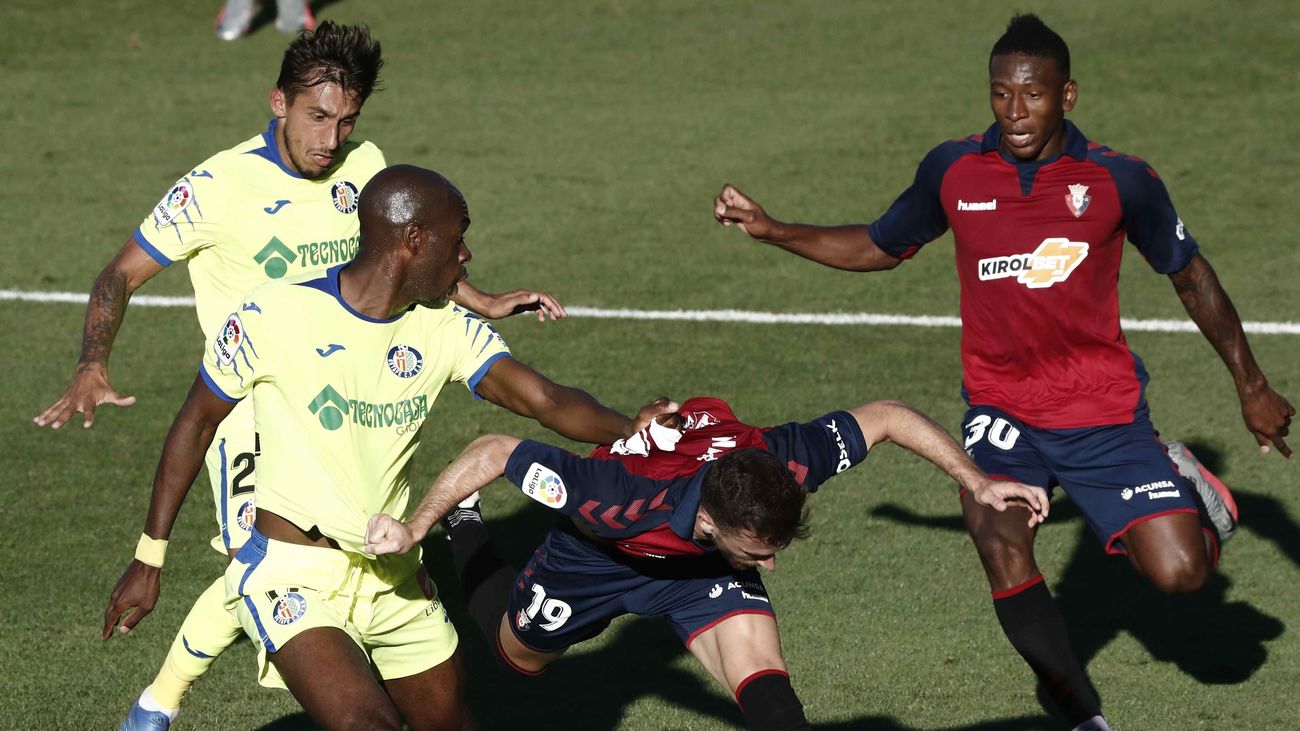 Osasuna emuló la presión con la que acostumbra el Getafe a someter a sus rivales con unos zagueros locales que jugaron adelantados para asfixiar la salida de balón de su enemigo. La única ocasión de la primera mitad llegó en el minuto 48 después de que Etxeita cabecease un centro de Arambarri desde el costado derecho en lo que fue el primer disparo entre los tres palos.