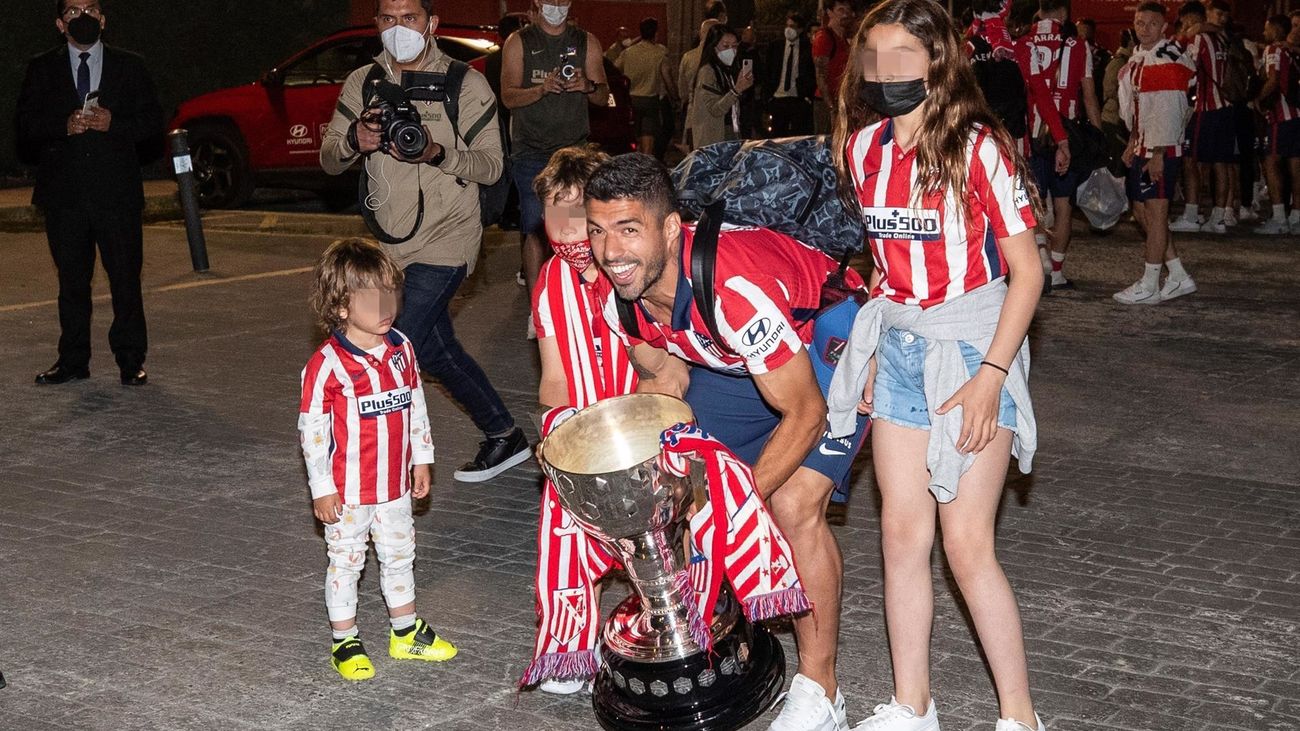 El delantero uruguayo del Atlético de Madrid Luis Suárez celebra con la afición a su llegada esta noche a la Ciudad deportiva Wanda, en Majadahonda |EFE