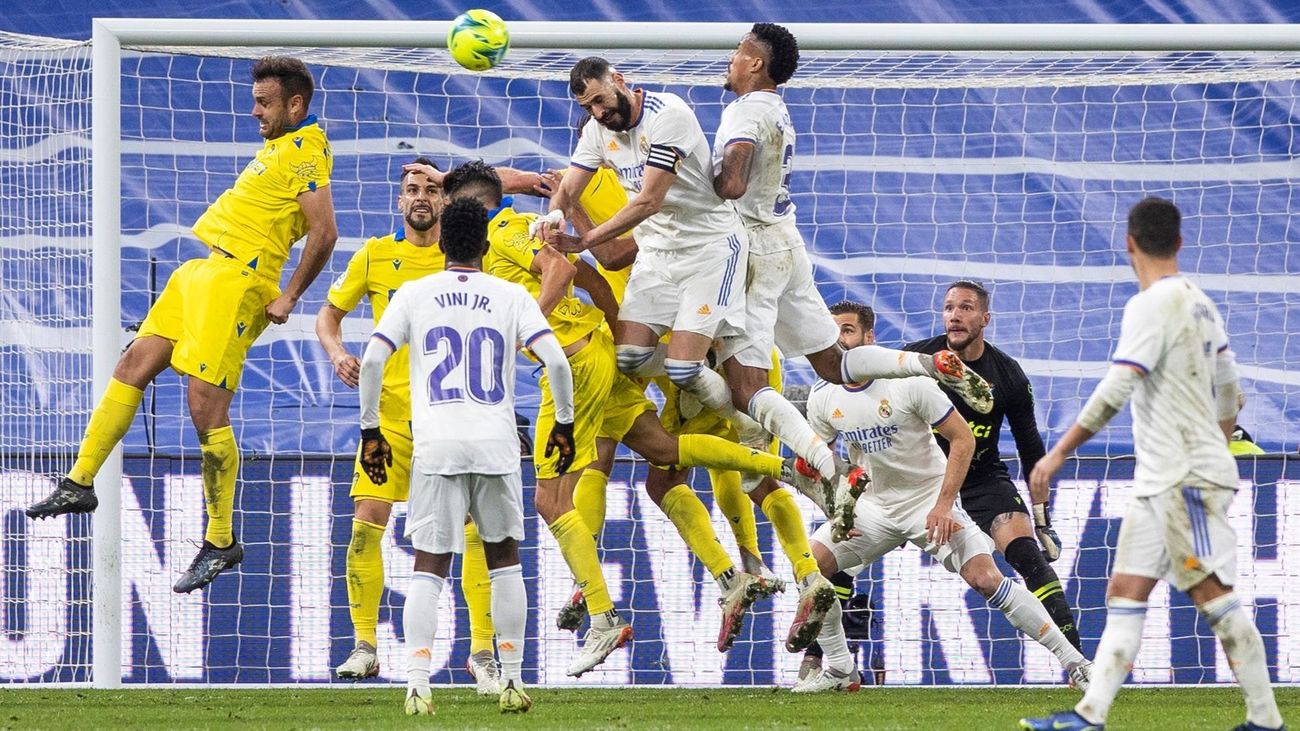 El Cádiz resistió el asedio despejando balones de todo tipo y con cualquier parte, legal, del cuerpo. 36 disparos del Real Madrid en todo el encuentro, 28 de ellos en una segunda mitad en la que fue superior más allá de la posesión, pero el balón no le quiso entrar este domingo a los de Ancelotti.