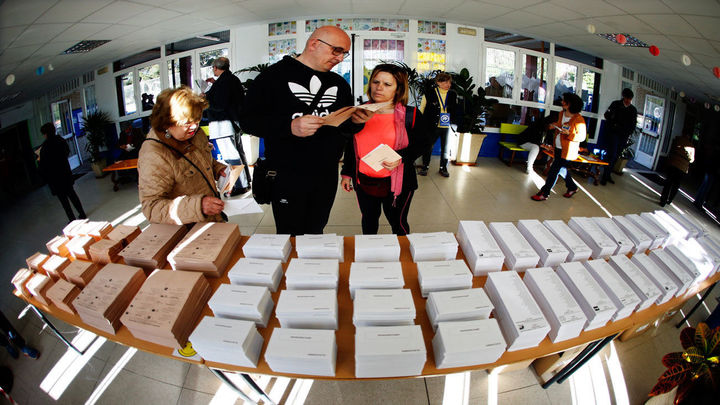 Mesa con papeletas y sobres en un colegio electoral |Telemadrid.es