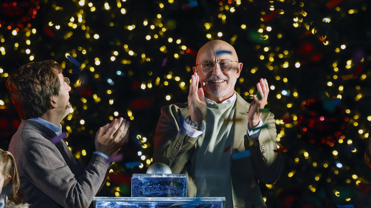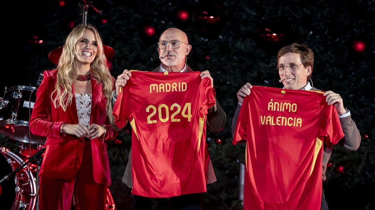 El seleccionador nacional de fútbol, Luis de la Fuente, ha sido el encargado de encender este año las luces de Navidad de Madrid junto al alcalde José Luis Martínez-Almeida, con el gran abeto navideño de casi 37 metros de altura iluminando la Puerta del Sol.