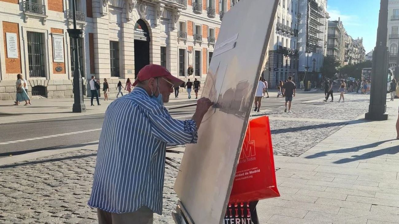 Situado en la zona central de la plaza, Antonio López trabaja en un cuadro en el que se aprecia la Real Casa de Correos, sede de la presidencia de la Comunidad de Madrid, y la calle Mayor.