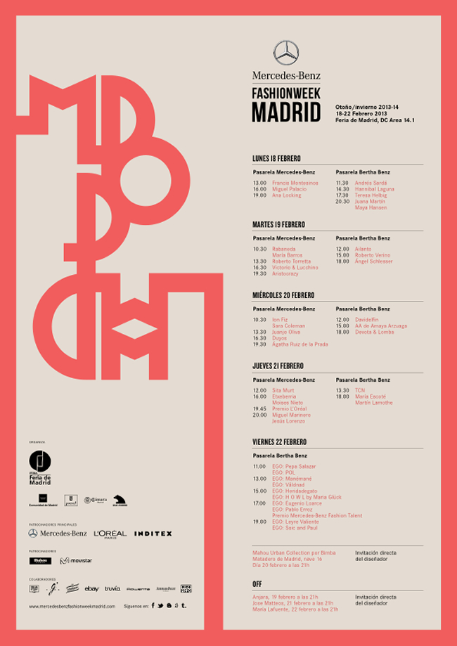 Los desfiles se desarrollarán de lunes a viernes. En concreto, entre el lunes y el jueves se celebrarán los desfiles de los creadores consagrados, y el viernes se dedicará íntegramente a los jóvenes creadores de EGO.