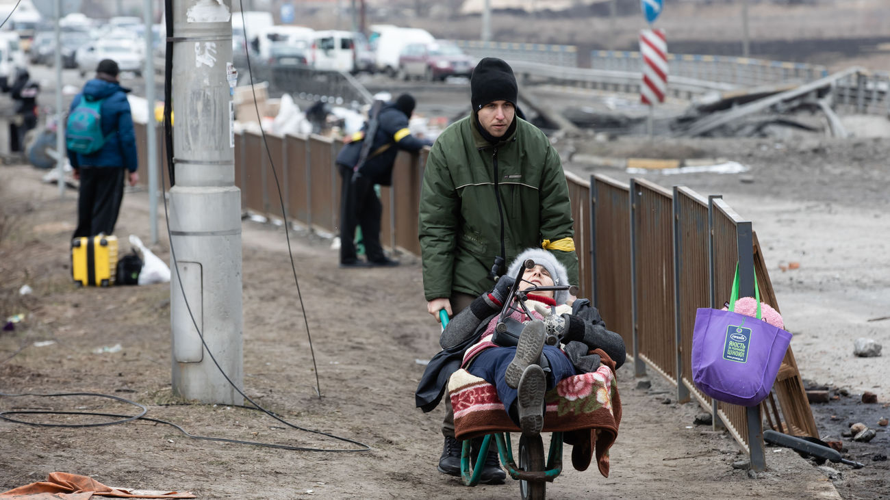 Un soldado empuja una carretilla que transporta a una persona durante la evacuación de residentes en Irpin |EUROPA PRESS