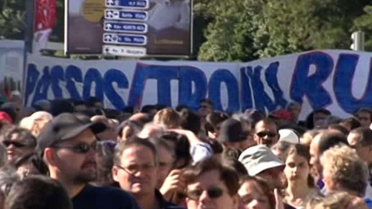 En la marcha de ayer los manifestantes exhibieron pancartas contra el primer ministro portugués, Pedro Passos Coelho, y la troika, formada por la Comisión Europea, el Banco Central Europeo y el Fondo Monetario Internacional (FMI).