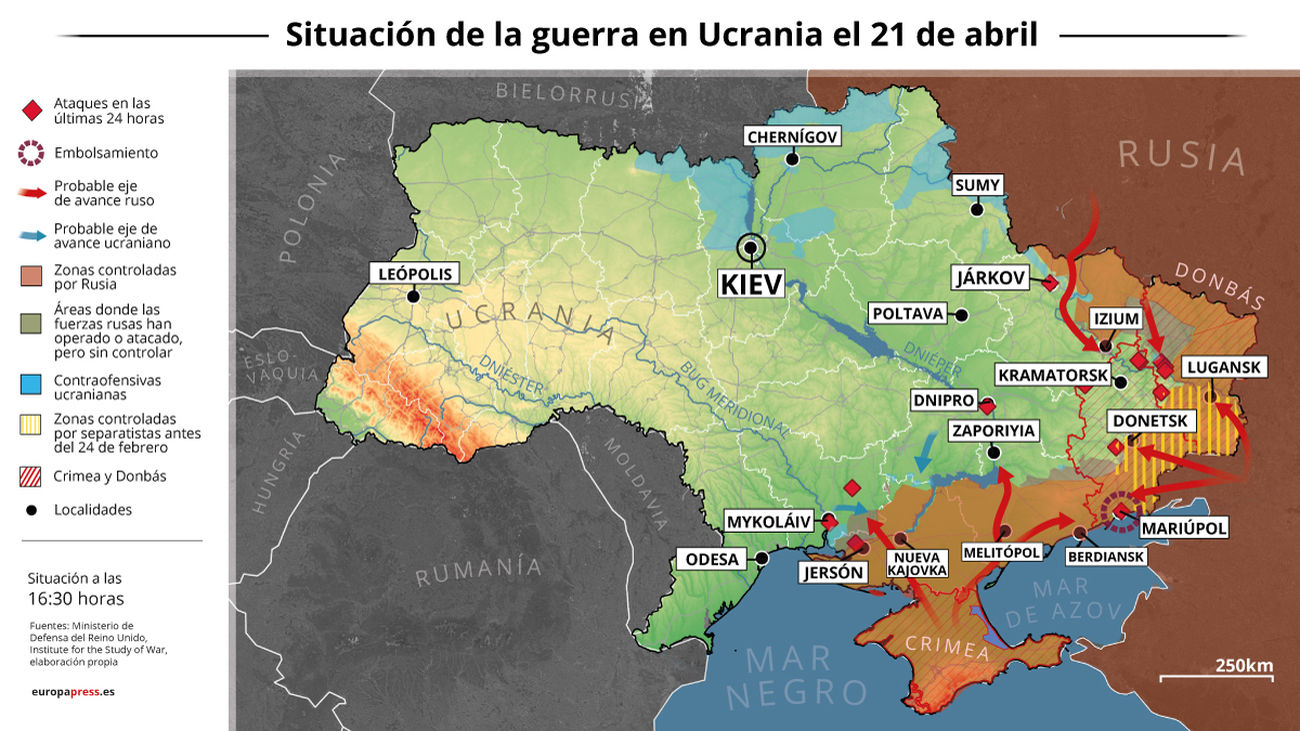 "En Mariupol la situación se ha normalizado. Los habitantes de la ciudad tienen ahora la posibilidad de moverse libremente por las calles sin esconderse del bombardeo de los nazis ucranianos", aseguró el portavoz castrense, Igor Konashénkov. Según dijo, se está entregando ayuda humanitaria a la población que permanece en la ciudad -unos 100.000 ciudadanos según Kiev- como alimentos, agua y artículos de primera necesidad.