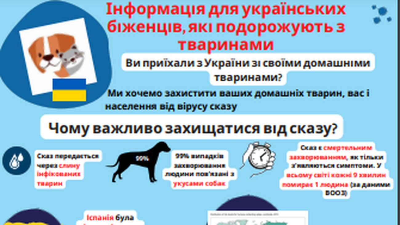 Mediante infografías en varios idiomas (español, inglés y ucraniano) se informa sobre las precauciones y acciones a realizar con estos animales. Ucrania es un país donde la rabia es una enfermedad endémica.