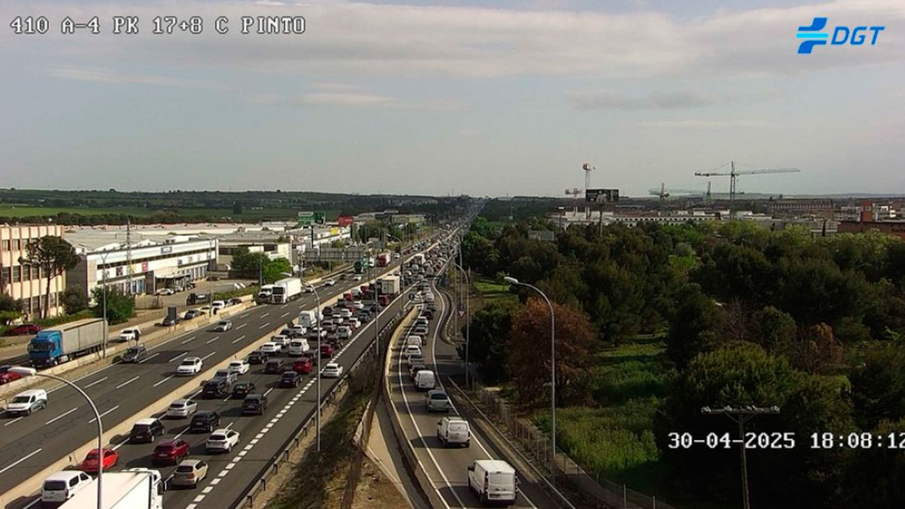 Con datos de la DGT de las 18.00 horas, las principales retenciones en la región, con circulación lenta, se concentraban en las salidas de la capital por la A-1, en La Cabrera; la A-3, en Rivas, la A-4, en Pinto; y la A-42, en Getafe.