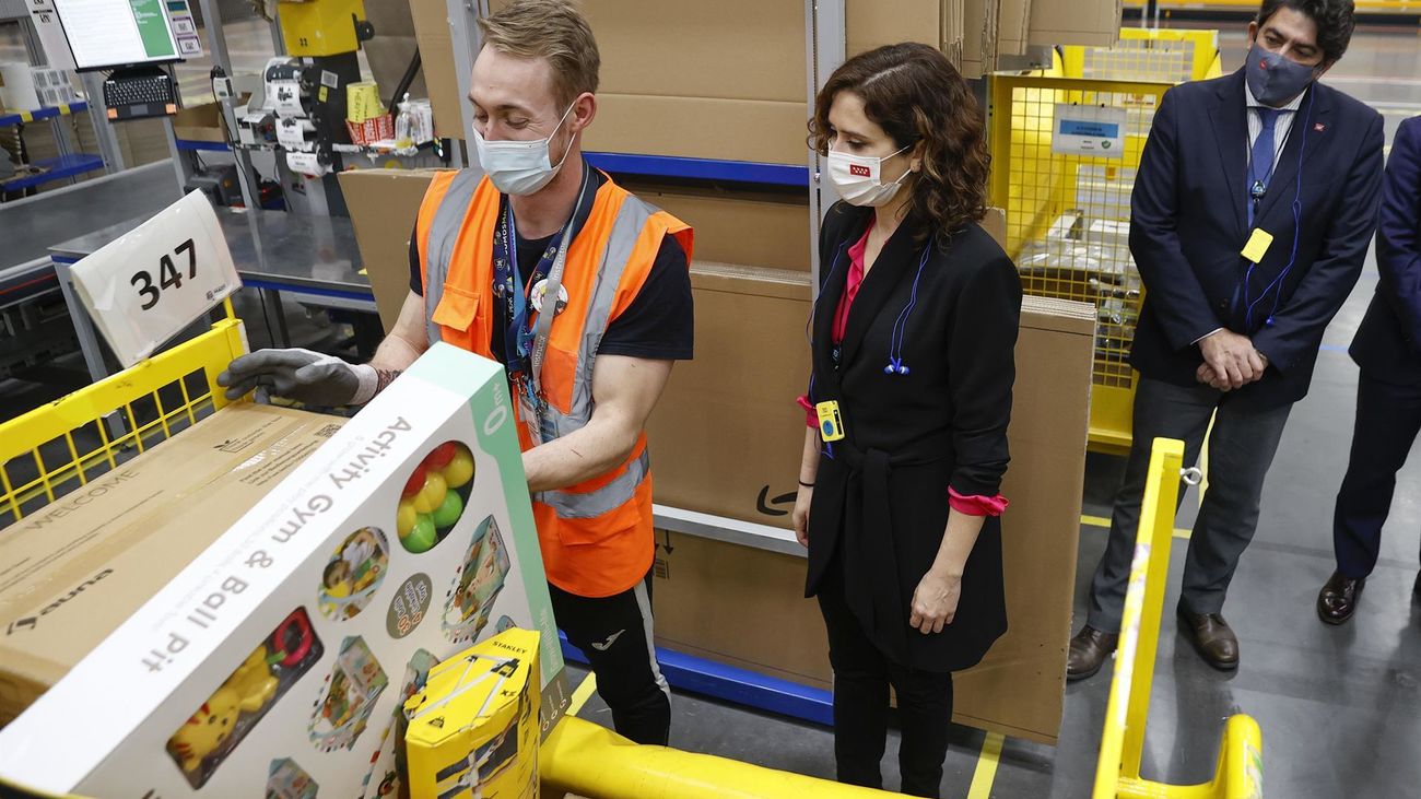La presidenta de la Comunidad de Madrid, Isabel Díaz Ayuso, visita el centro logístico de Amazon en Alcalá de Henares |EFE/ Chema Moya
