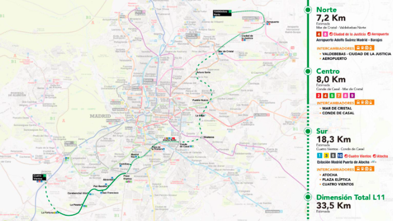 Esta línea se convertirá en una gran diagonal que vertebrará la capital de suroeste a noreste y se desplegará a lo largo de tres tramos. El primero de ellos lo rematará el intercambiador de Conde de Casal, uno de los cuatro programados por la Comunidad.
