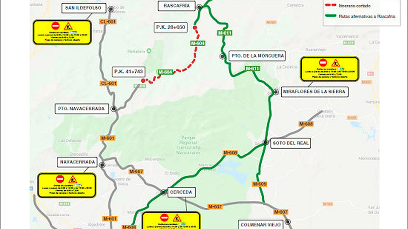 Mientras las obras se estén ejecutando, para acceder al municipio de Rascafría y a las zonas de ocio cercanas sólo se podrá llevar a cabo por la carretera M-604 que, partiendo Lozoyuela de la autovía A-1 accede a Rascafría y a las zonas de ocio cercanas al mismo.