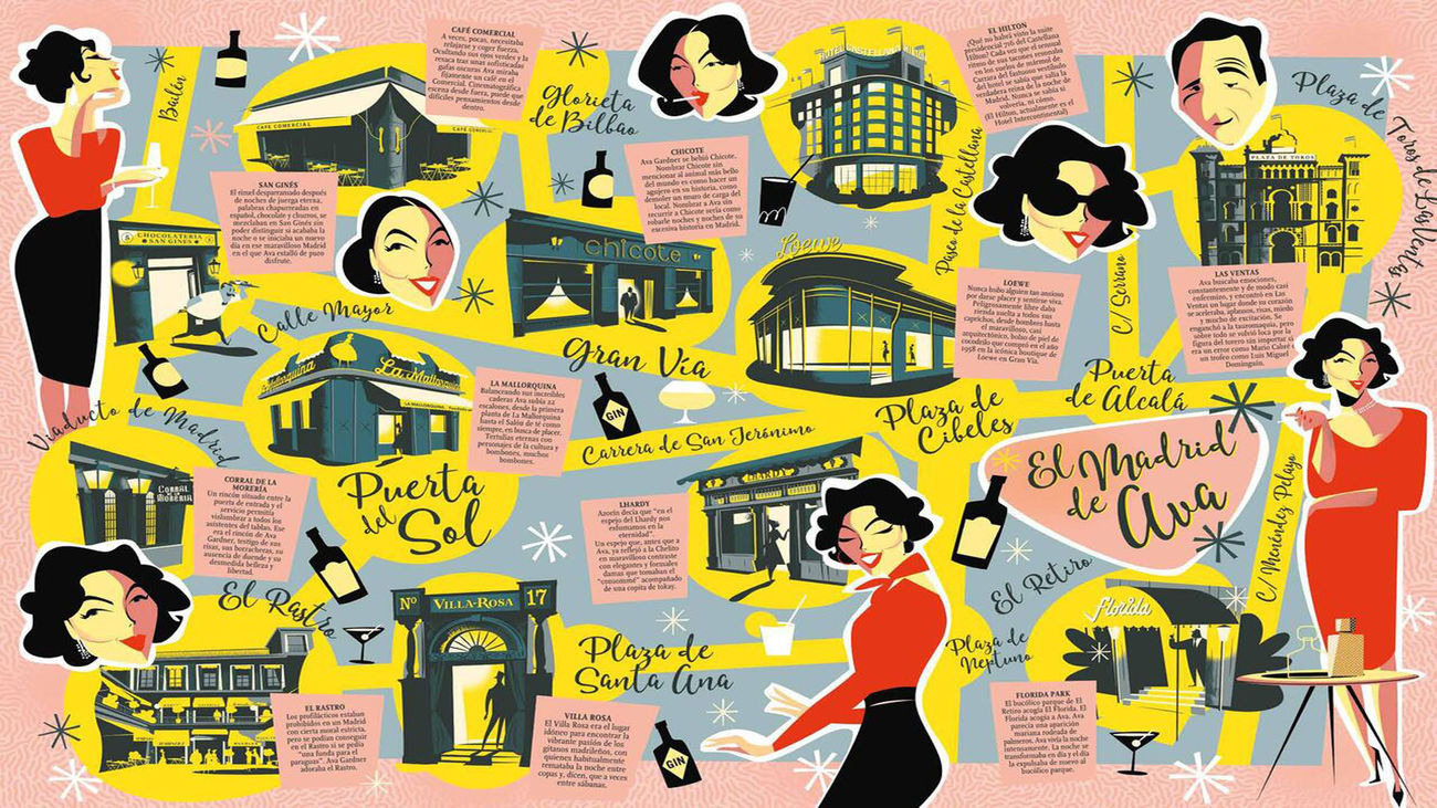 Lhardy, la Mallorquina, la chocolatería San Ginés, el Café Comercial, la tienda de Loewe de la Gran Vía, Las Ventas o el Rastro son algunos de los lugares que frecuentaba en la ciudad y que ilustra Jorge Arévalo. Una ruta de la que ofrece también su mirada el escritor Manuel Vicent, que ha publicado este año la novela, Ava en la noche.