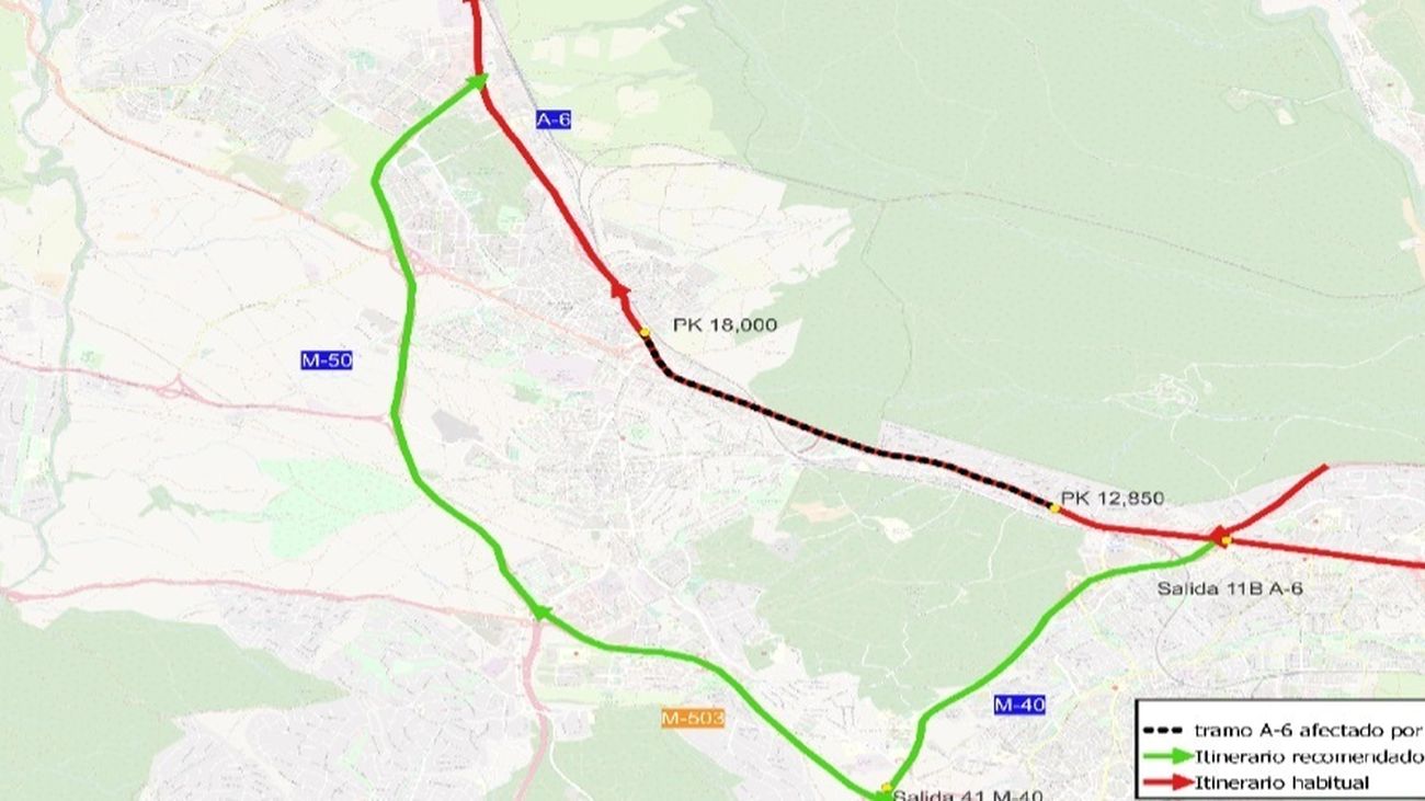 Las alternativas para las posibles retenciones que se puedan producir en esta zona serán en el sentido creciente (sentido A-6) por A-42 a M-40 hasta la salida 40 para tomar M-503 y M-50 dirección A-6.