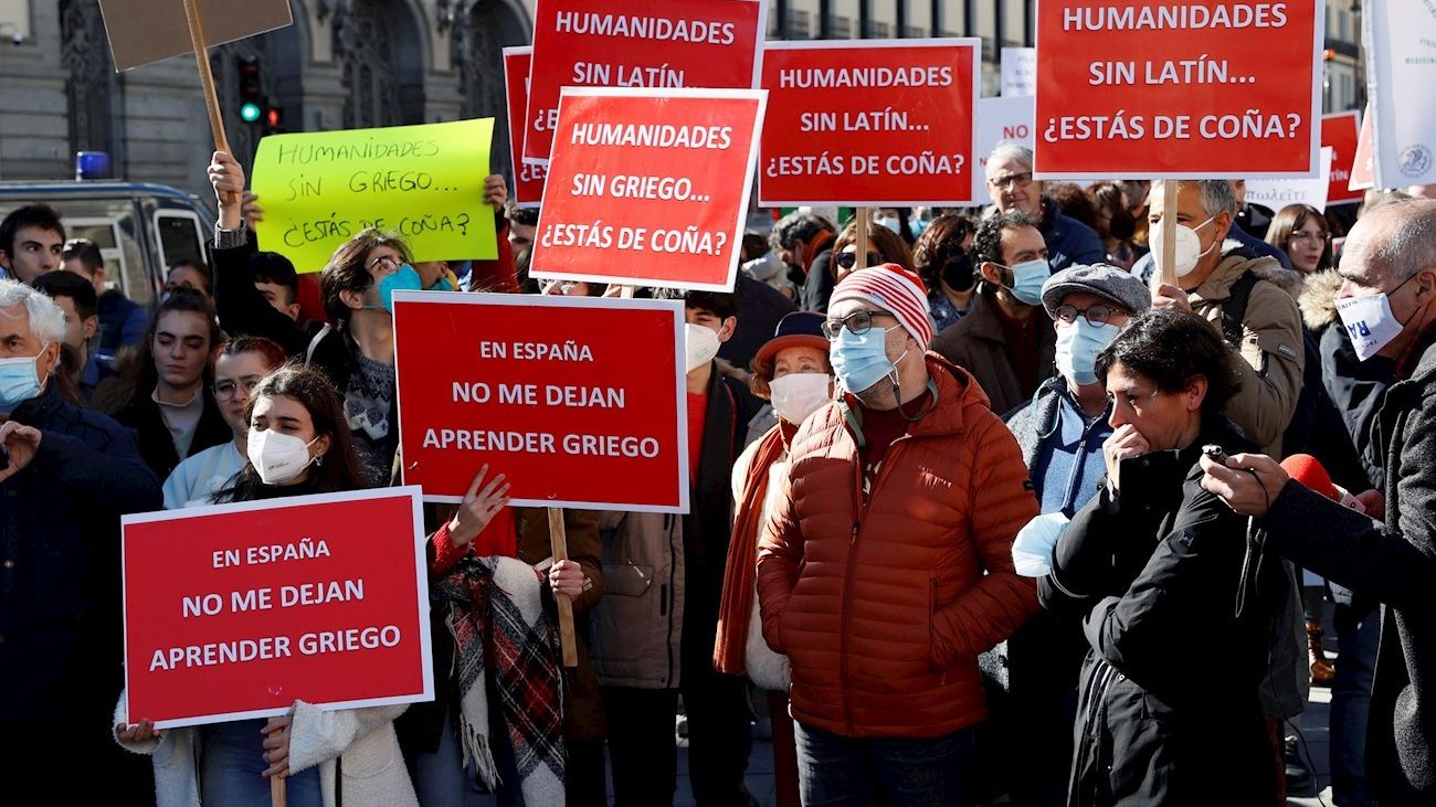 Alumnos y profesores de Secundaria, Bachillerato y Universidad de varios puntos de España se han concentrado este sábado frente al Ministerio de Educación, en el centro de Madrid, para pedir al Ejecutivo que "no asesine" del currículo escolar el Latín, el Griego ni la Cultura Clásica.