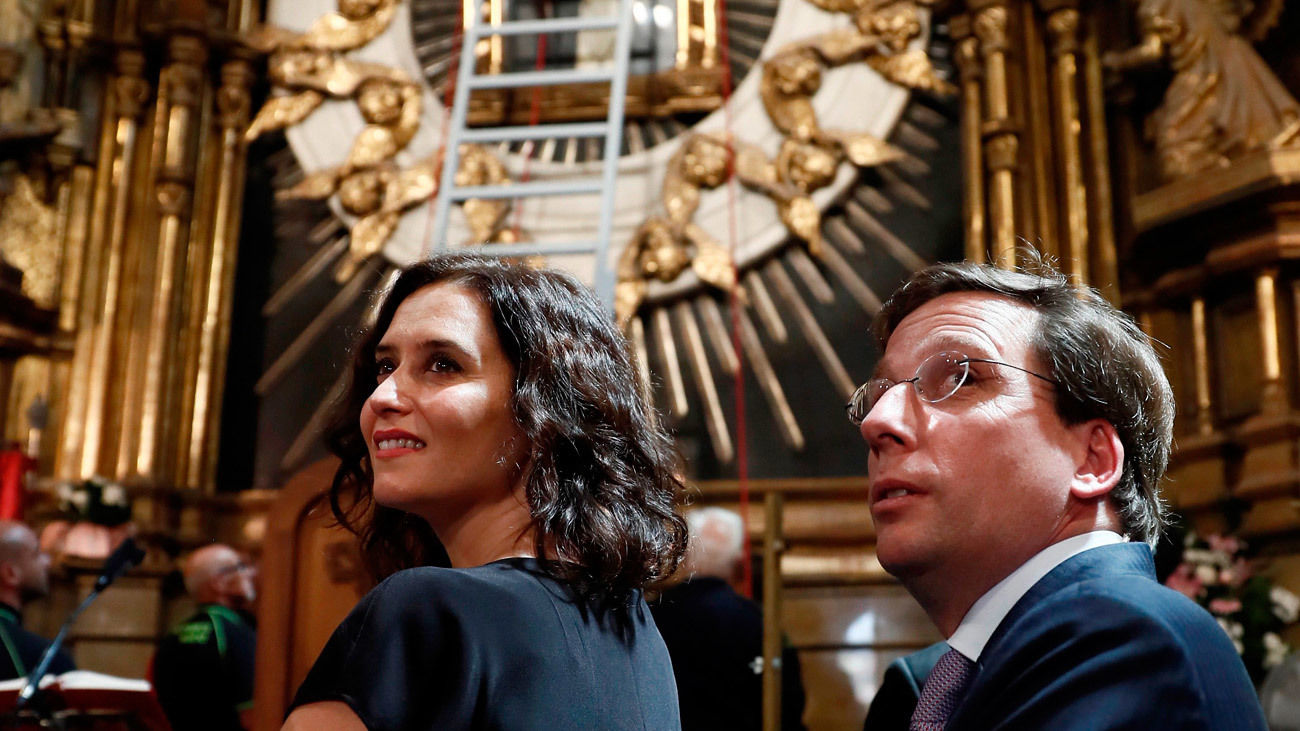 Ayuso y Almeida, presidenta de la Comunidad y alcalde de Madrid, en el tradicional descenso del cuadro de la Virgen de La Paloma