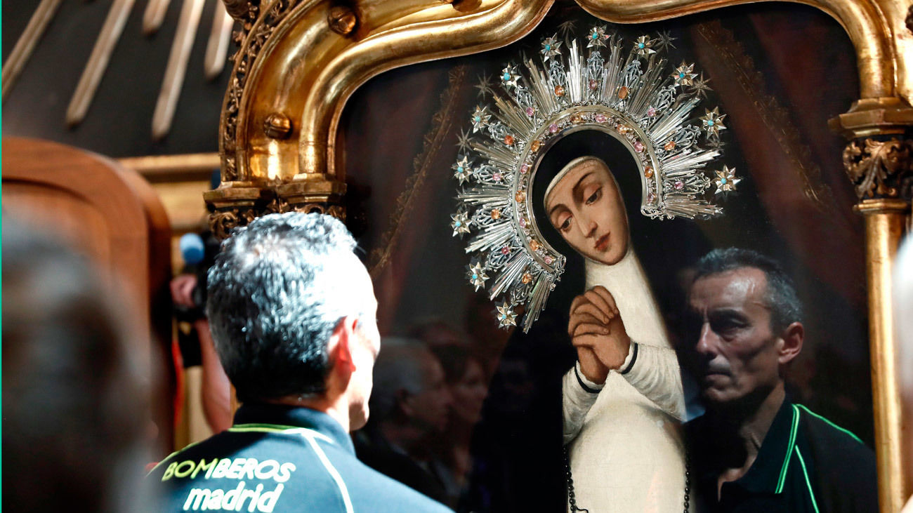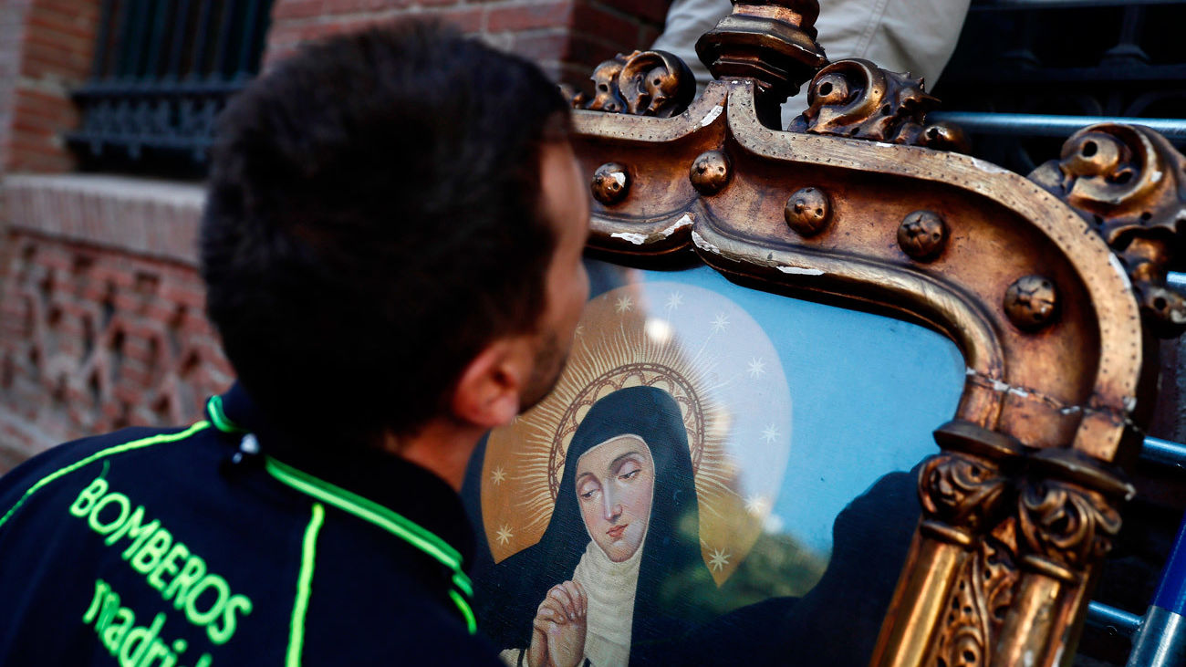 Un bombero frente a al cuadro de la Virgen de la Paloma, patrona de los bomberos, tras el tradicional descendimiento del cuadro