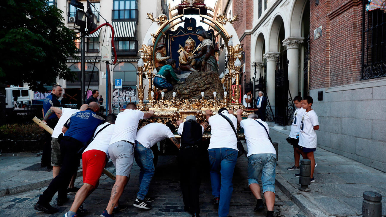 Un Bomberos y chulapos en los preparativos para el tradicional descendimiento del cuadro de la Virgen de La Paloma