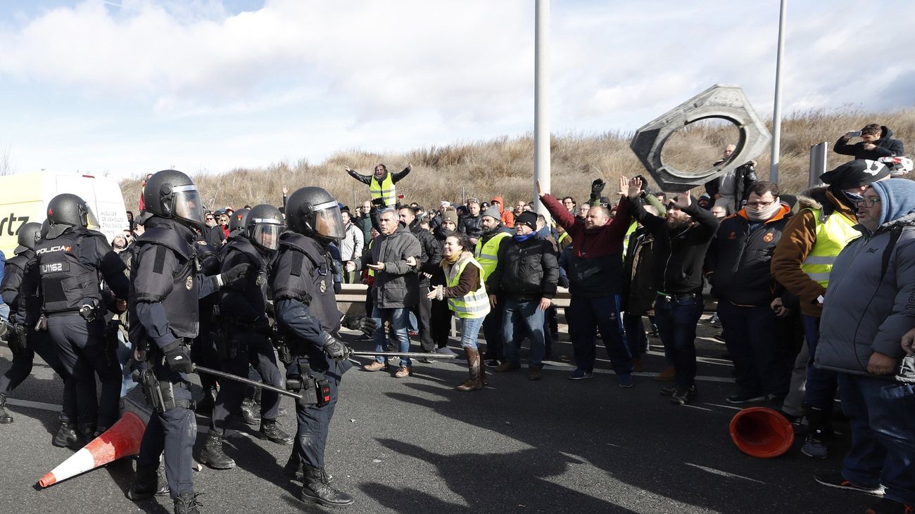 Miles de taxistas inician una manifestación en los accesos al recinto ferial de Madrid, Ifema, con gritos de protesta y pancartas donde se lee la inscripción 'El taxi de Madrid exige que se cumpla la ley'. La manifestación está atentamente vigilada por la Policía, mientras sigue el fuego en los contenedores a los que los bomberos tratan de acceder.