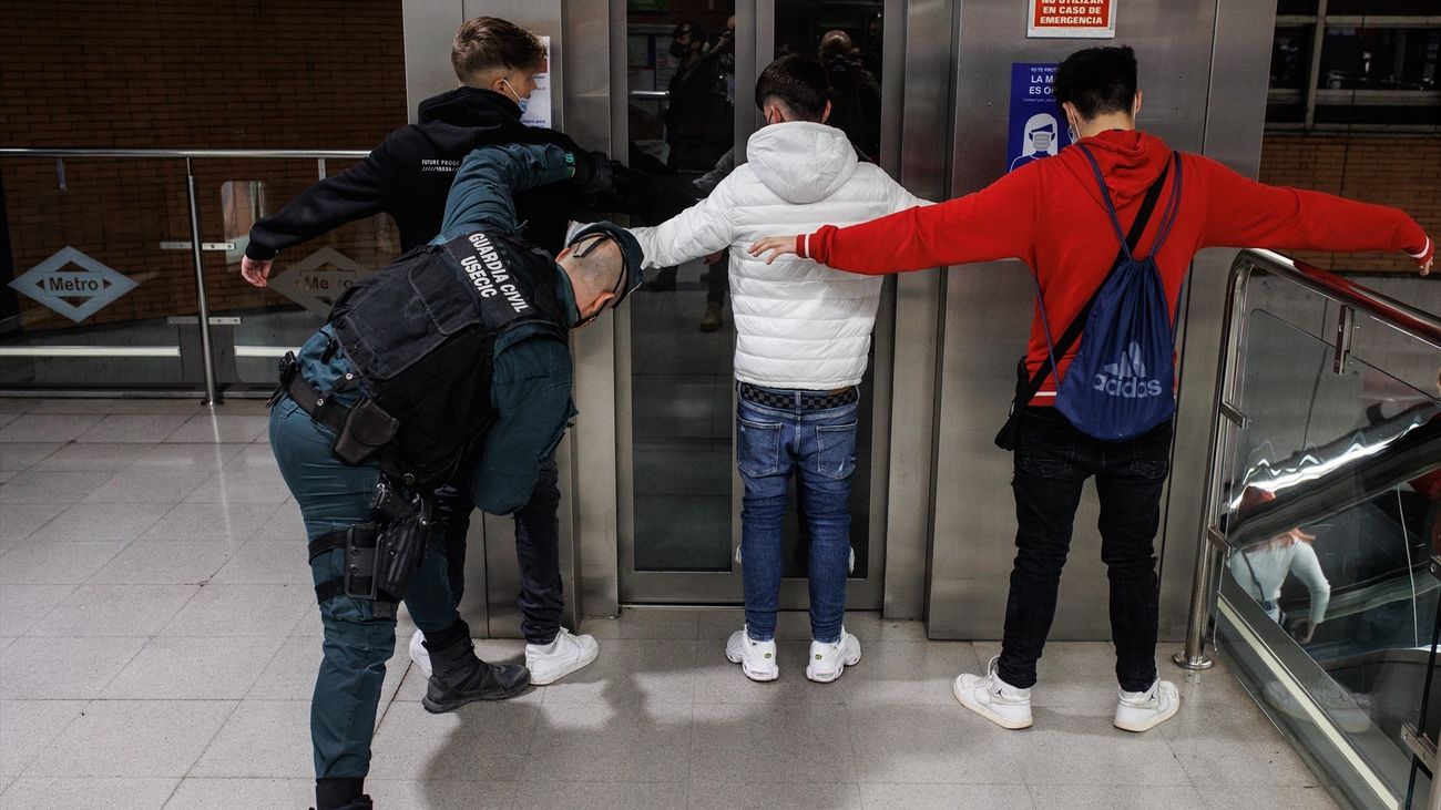 Dos agentes de la Guardia Civil cachean a dos jóvenes en un control para prevenir la violencia entre bandas juveniles, en la estación de metro de Arganda del Rey |EUROPA PRESS