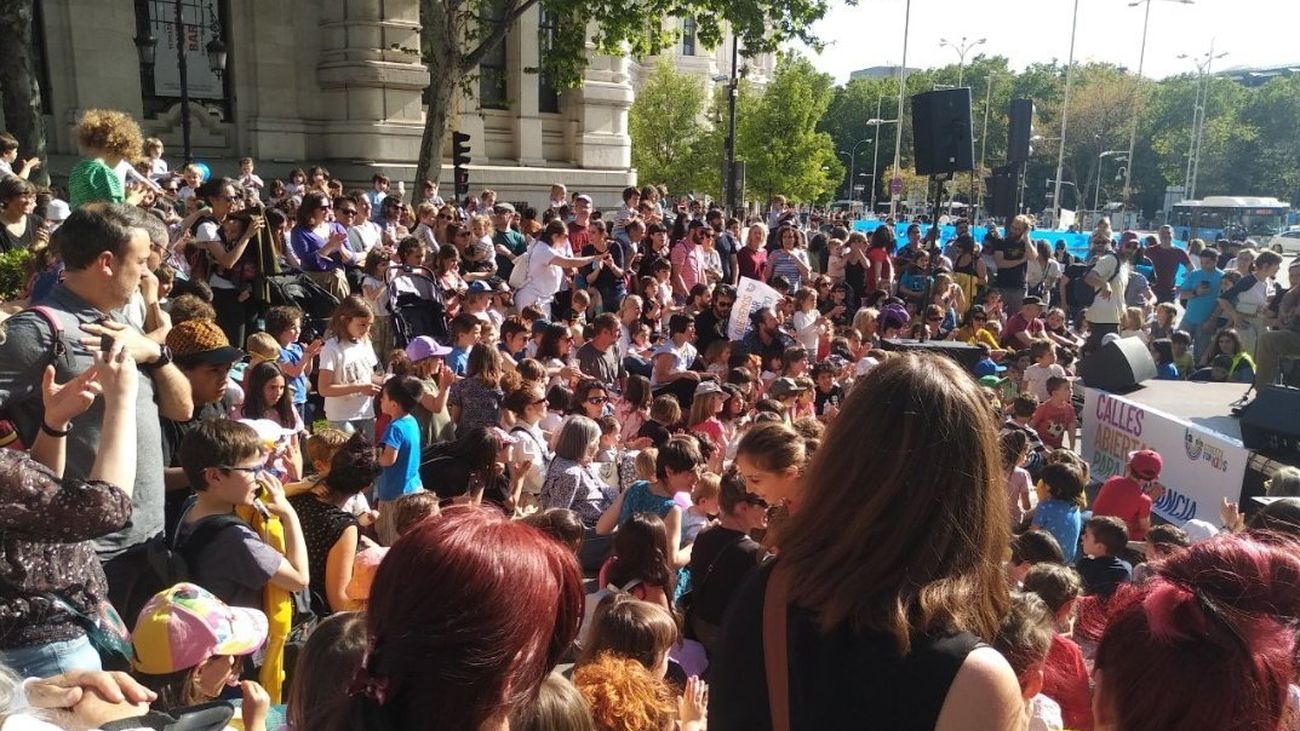 Padres, madres, escolares y educadores han compartido el espacio entre Cibeles y Alcalá que durante un rato se ha convertido en zona de juegos, de intercambio de experiencias y de llamada de atención.
