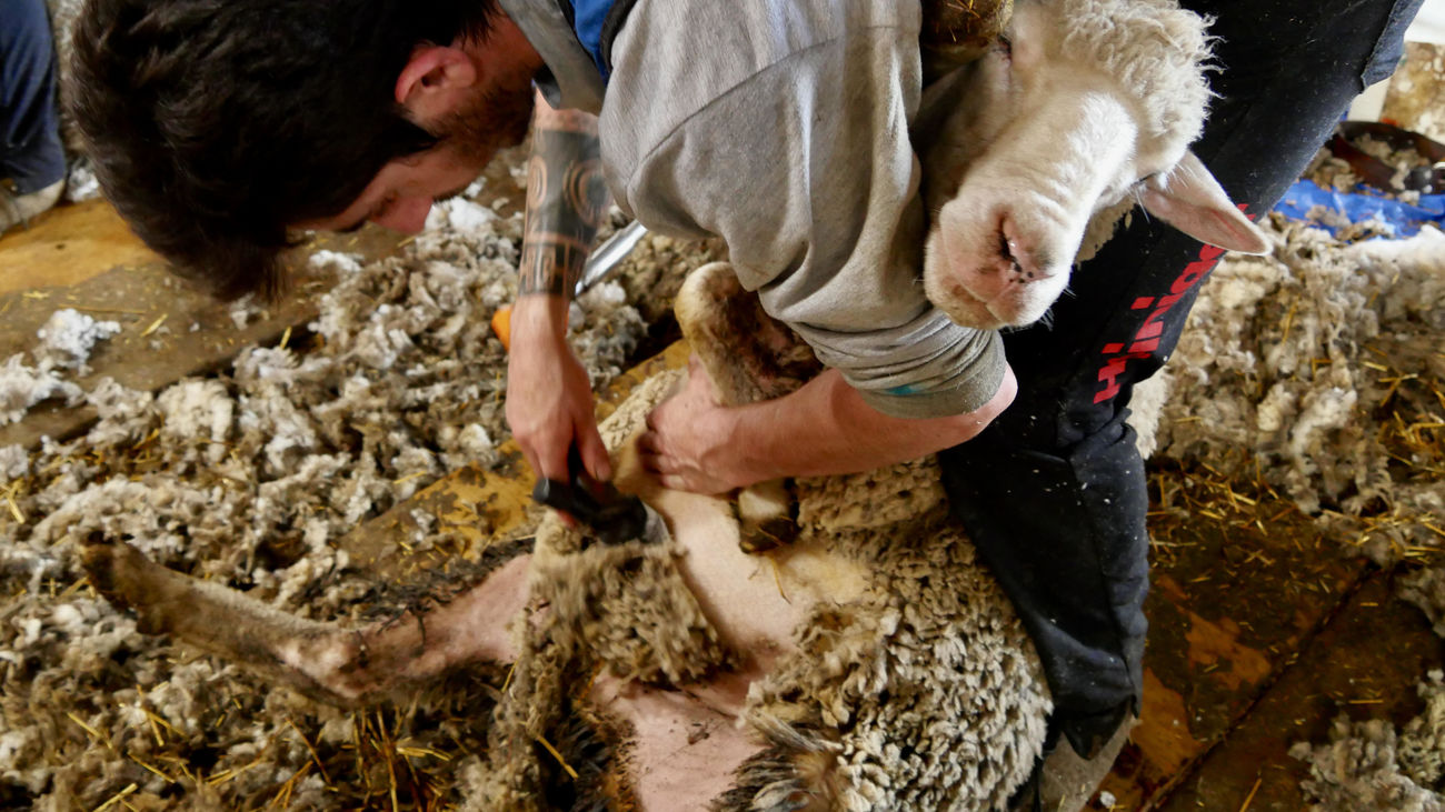 Un esquilador retira el vellón mientras su compañeros realizan el corte de la lana al ganado |TRASHUMANCIA Y NATURALEZA