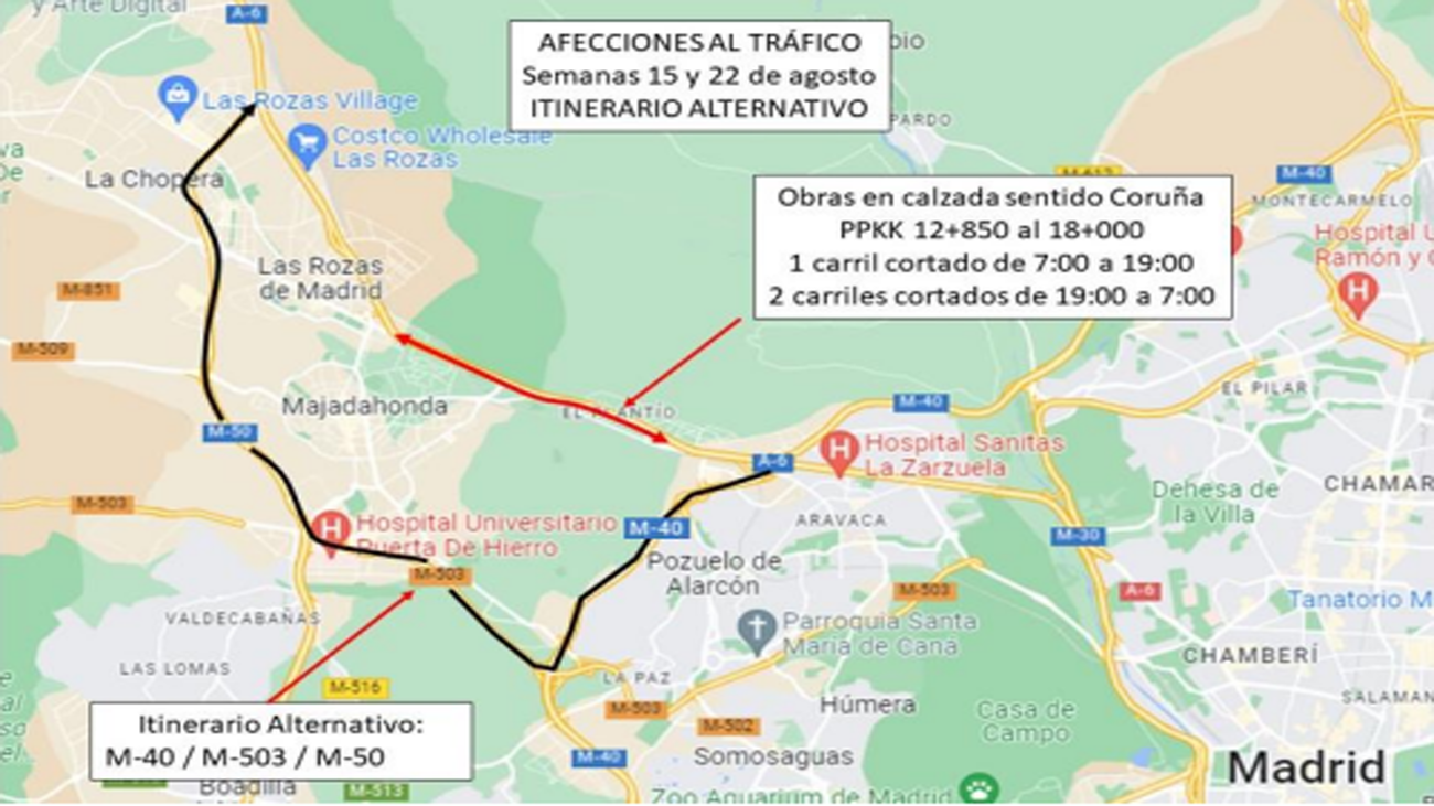 La calzada Bus-VAO permanecerá abierta en sentido Madrid de 06.30 horas a 11.30 horas de la mañana, y en sentido Coruña de 12.00 horas a 23.00 horas, habilitándose dicha calzada como calzada central de acceso libre según las intensidades de tráfico que se registren. No se producirán afecciones al tráfico los fines de semana y festivos. Como itinerario alternativo, se recomienda el corredor M-40/M-503/M-50.