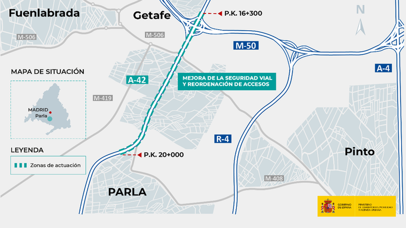El Ministerio de Transportes, Movilidad y Agenda Urbana (Mitma) ha formalizado, por 1,37 millones de euros, un contrato para la redacción del proyecto de mejora de la seguridad vial y la reordenación de accesos en un tramo de la autovía A-42, entre la M-50 y Parla Norte.