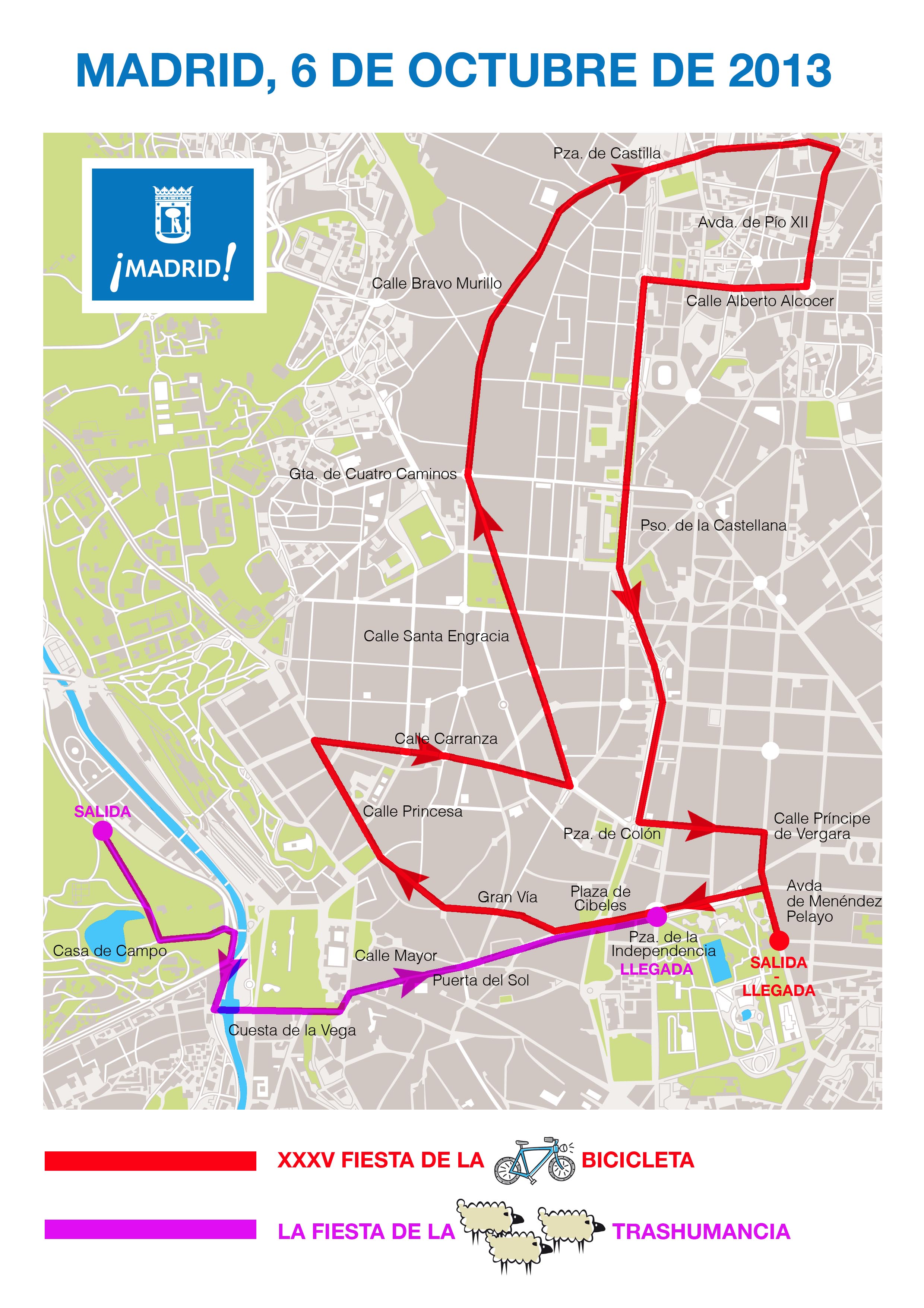 El Ayuntamiento de Madrid ha preparado un dispositivo de circulación con motivo de la celebración el próximo domingo, día 6 de octubre, entre las 9 y las 12.30 horas, de la XXXV edición de la Fiesta de la Bicicleta Villa de Madrid, con el fin de paliar la incidencia que esta tradicional cita deportiva tiene en la circulación de la capital. También ha elaborado otro plan con motivo de la celebración este mismo día, a partir de las 8 horas, de la Fiesta de la Trashumancia.