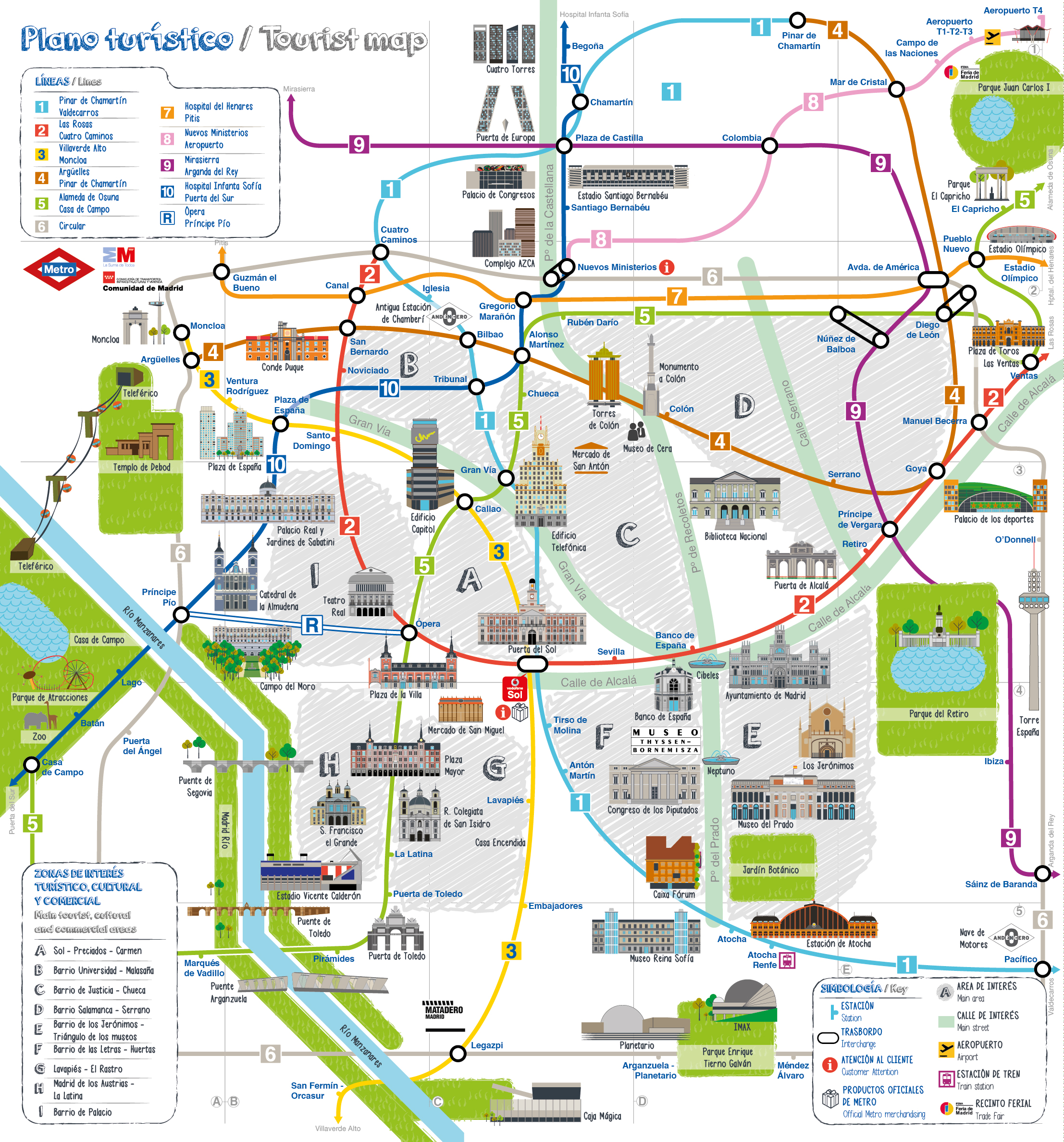 Metro de Madrid ha puesto en circulación un plano en el que aparecen iconos de los monumentos y sitios de interés turístico, cultural y comercial de la ciudad de Madrid para que los turistas puedan llegar hasta ellos de forma sencilla y utilizando el suburbano, al tiempo que constituye un nuevo soporte publicitario para potenciales anunciantes.