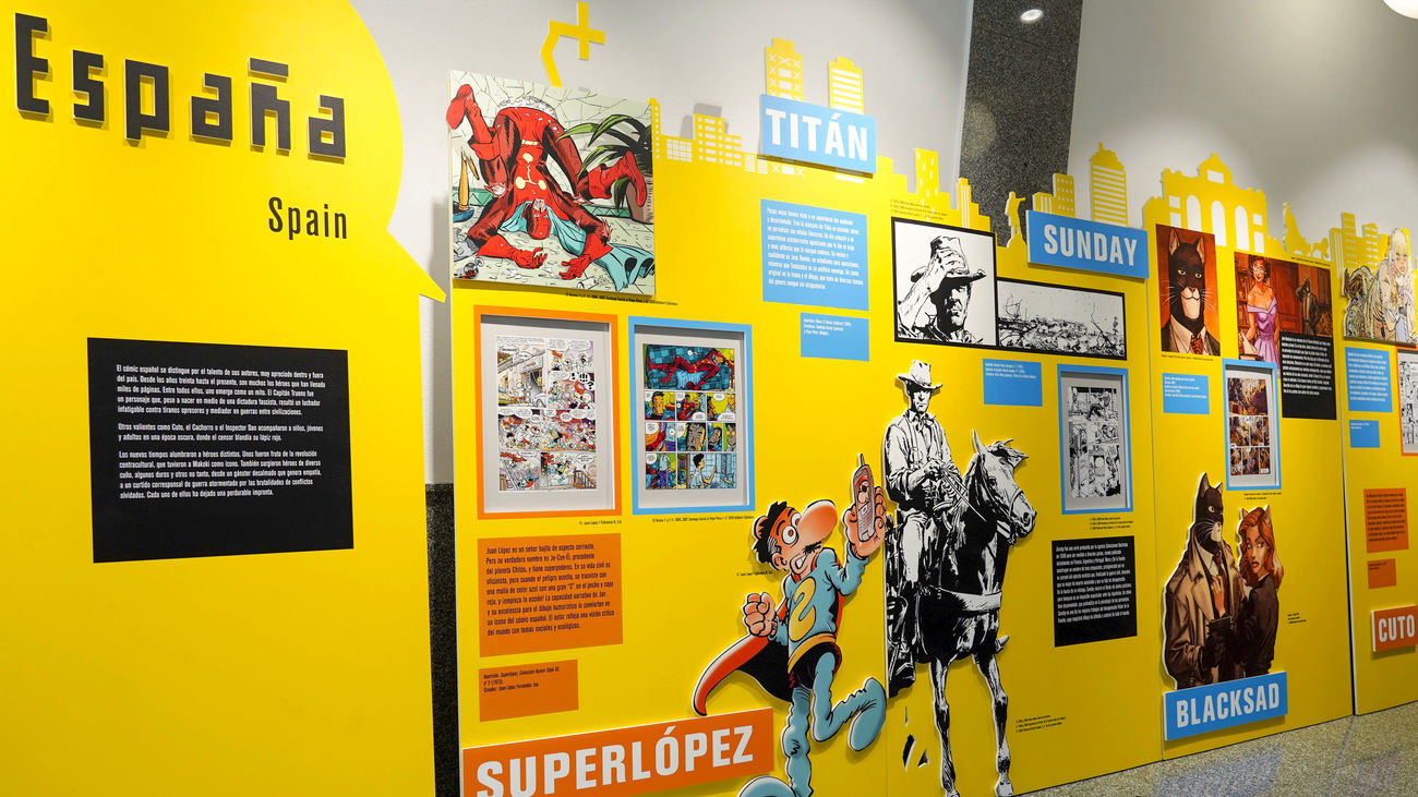 La muestra consta de 43 paneles expositivos con cada uno de los personajes. Todos los héroes del cómic de la exposición han sido publicados en España. En la actualidad la industria del cómic en nuestro país goza de buena salud, tanto a nivel productor, exportador e importador de historietas y tebeos de toda Europa.